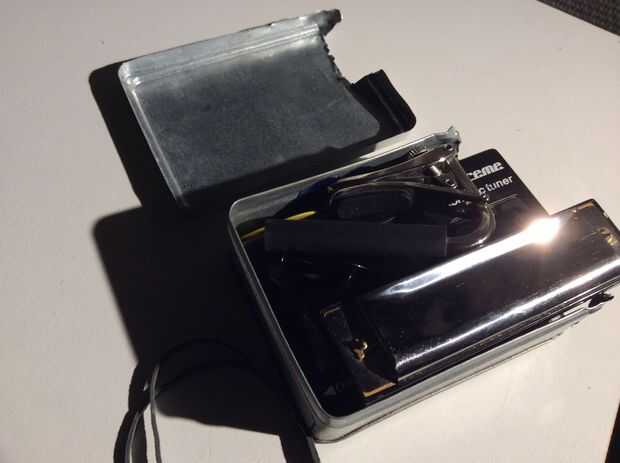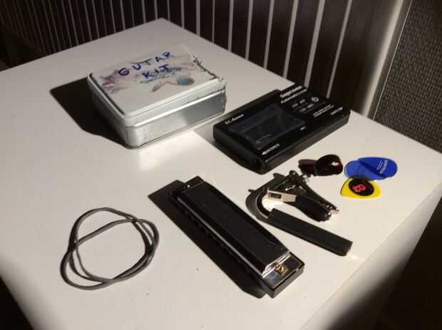 este es mi Kit de supervivencia de guitarra! Su muy útil para tener con usted.Paso 1: Cuál es interior Interior hay:Armónica de 1 boca1 sintonizador3 seleccionesY 1 caboPaso 2: cosas Todo a ned a juego, tune y en la guitarra es, y si tienes un amigo