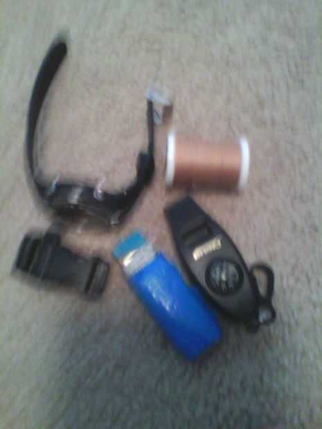 tengo un reloj resistente al agua, kit de costura, artes de pesca, cinta y brújula