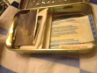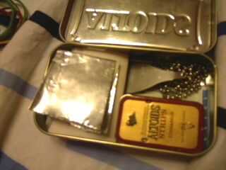 mis componentes lata Altoids supervivencia:1.Condom-puede ser utilizado para almacenamiento de agua o su finalidad.2 plata moneda-utilizado para wtshtf moneda/trueque.3.gauze-utilizado para lesiones de menor importancia como cortes o raspaduras para