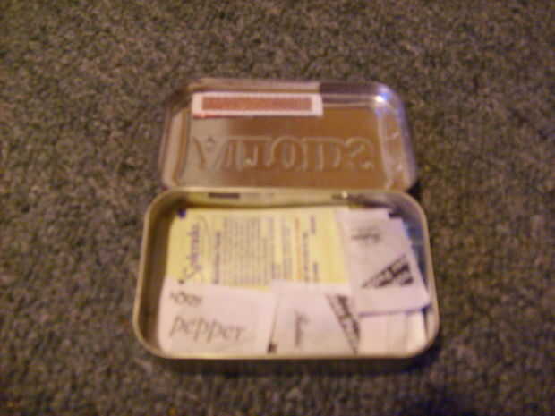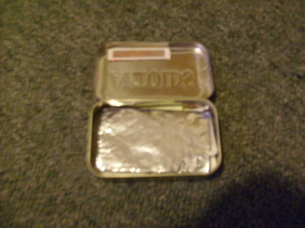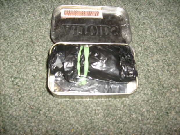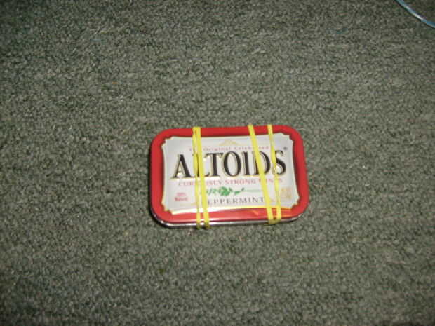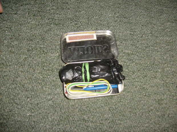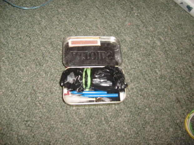 5) Coloque el cortador de la caja, ocho de los fósforos y velas junto a la bolsa de basura. Enrollar el sedal en el último palo de partido y colocar en la lata. Coloque cinco bandas de caucho extras en la lata.
