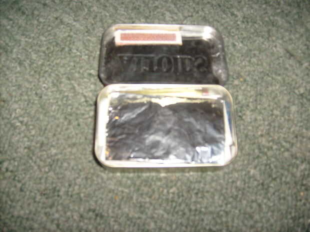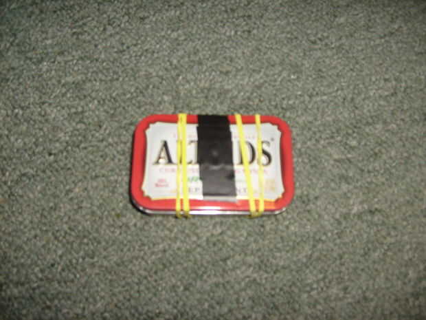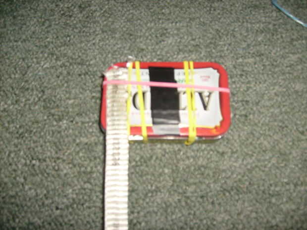 7) lugar nueve tiras de cinta, uno encima del otro, en la tapa de la lata. (Esto es cinta extra para uso más adelante si usted lo necesita, y también puede tomar la cinta de la cuchilla si necesita cinta.)