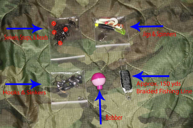 Parece que cada kit de supervivencia tiene algún tipo de kit de la pesca y minas no es diferente. Durante años llevé a monofilamento normal, en los últimos años más fuerte, más durables líneas han llegado en el mercado. Hace unos años cambié a monofilamento para una línea trenzada. Utilizar una línea de prueba de 50lb que tiene un diámetro de línea de monofilamento de 6lb estándar. Tengo un surtido de gusanos, cabezas de jig, y spinner cebos, así como varios ganchos y pesos. Gira rápido, eslabones giratorios barril y granos plásticos acabar el kit de pesca.