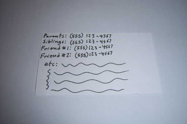 Hay unas cuantas permutaciones de éste: batería descargada y no hay cable de carga, deje caer el teléfono y romperlo, carteristas que usted consiga en el metro. El punto es, la mayoría de la gente realmente no recuerdo los números de teléfono de las personas más cercanas a ellas, la gente que quiera llamar si estuviera en una situación difícil. Y todo lo que os separa del teléfono puede convertirse en un verdadero inconveniente, especialmente durante el viaje. Por eso una pequeña lista de tamaño tarjeta de presentación de la información de contacto de tus amigos y familiares y compañeros de trabajo pueden ser un ahorrador de vida real en un lugar duro. Anote en la tarjeta (en el código si eres paranoico de perder en algún lugar) y guardarlo en tu equipo de supervivencia para ese día de lluvia.