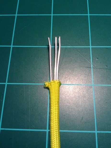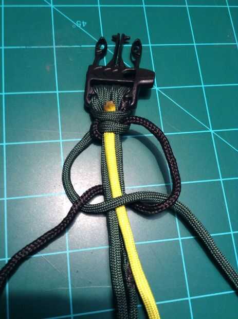 El paracord amarillo pasar por debajo de la superficie de la pulsera y sostener el cable. Esta parte será más fácil porque sólo he utilizado tres trozos de alambre, y el paracord es mucho más corto. A continuación colocar las otras tres piezas de paracord a la hebilla.