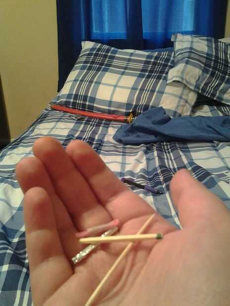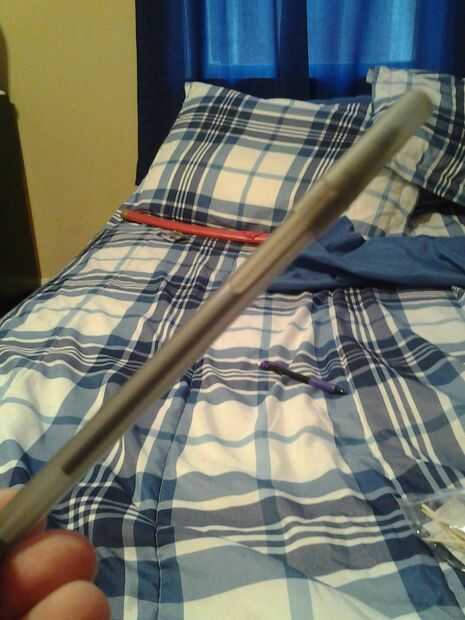 recoger una pluma bic (para todo), banda de goma (para llaves) (envuelto en cinta), selección de diente (para eliminar materia de los dientes), fósforo (luz) (envuelto en papel de aluminio), papel aluminio, cinta.