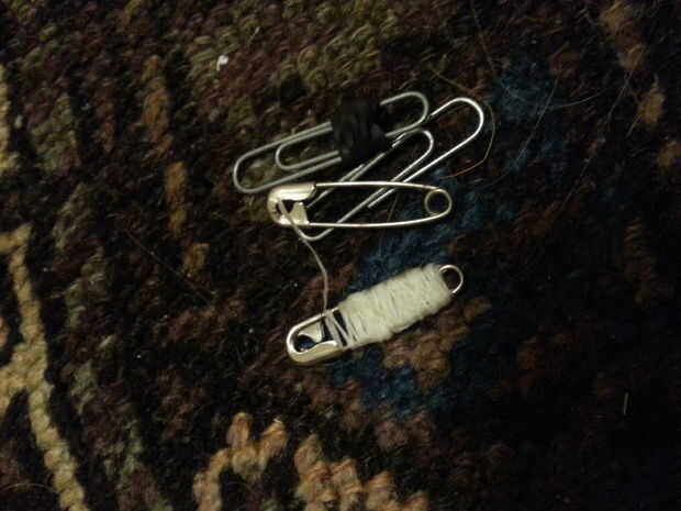 Paso 2: pernos de seguridad, Clips de papel e hilo de pescar