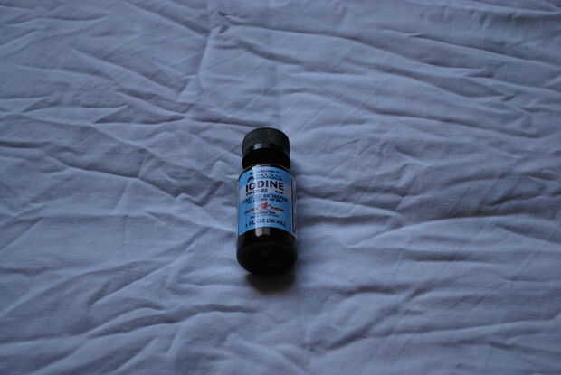 Asegúrese de que tiene la tintura de yodo 2%. Puede utilizar esto para un par de cosas. Puede ser utilizado como una antiséptico de primeros auxilios, y puede purificar agua de gira con él.