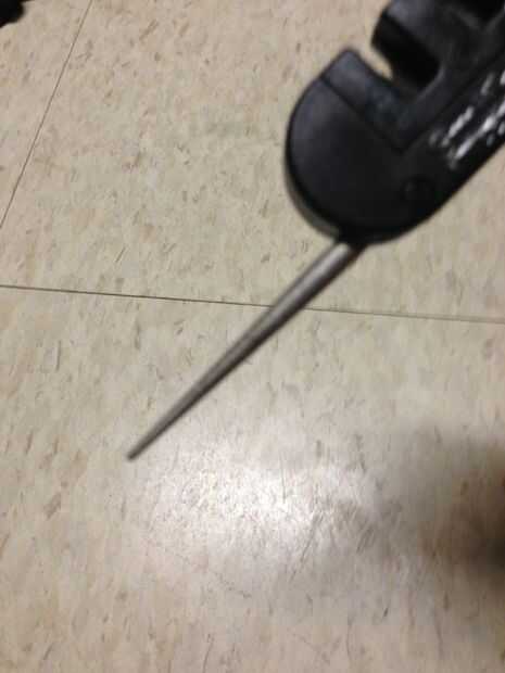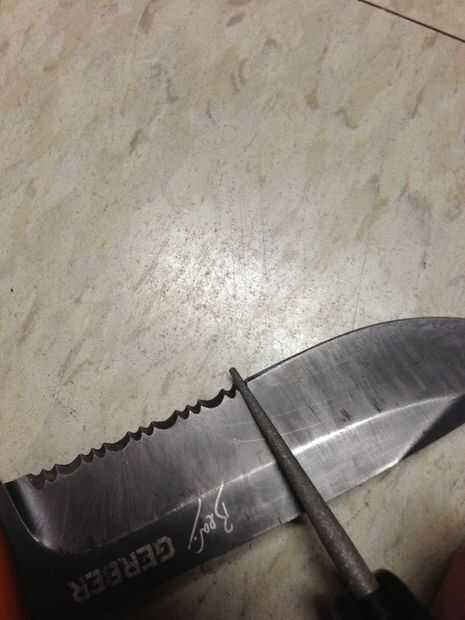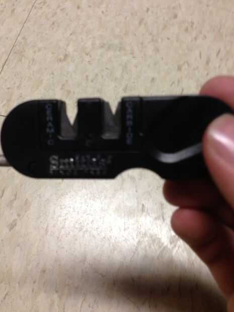 Si no quiere llevar un sacapuntas enorme donde quiera que vaya, buscar en tiendas deportivas y al aire libre para los smiths de pocket pal. Esto cuesta alrededor de $4-$6 dólares dependiendo de donde usted lo compra de. Tiene un sacapuntas grueso de carburo y los ángulos y cambiarse después de un montón de uso para un juego nuevo afilar con. Tiene un borde fino cerámica para retocar y perfeccionar el borde de la hoja. Lo que más me gusta es el afilador de serrada. Es en forma de cono y cerraduras en lugar de afilar esos molestos bordes aserrados.