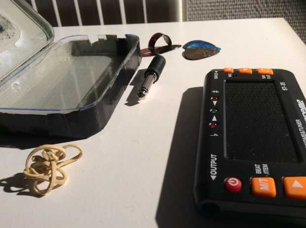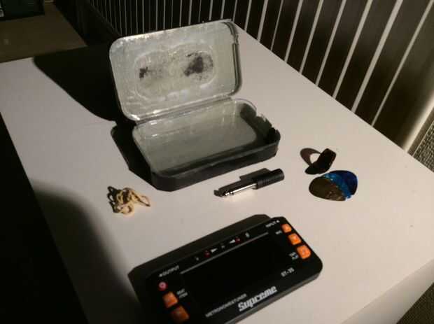 este es mi Kit de supervivencia de guitarra! Su muy útil para tener con usted.Paso 1: Cuál es interior Interior hay:Armónica de 1 boca1 sintonizador3 seleccionesY 1 caboPaso 2: cosas Todo a ned a juego, tune y en la guitarra es, y si tienes un amigo