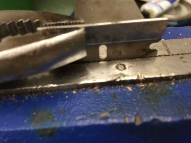 El cuchillo: esta es la parte superficial. Agarra una navaja a un lado solo. Póngalo en su vice en el grosor que desee. Elegí a la derecha en el agujero central. Sosteniendo la parte superior con pinzas hasta la parte superior no volar, golpear con un martillo. Usted debe dejarse con la parte inferior la mitad. Romper la parte inferior la mitad de la misma manera. Elegí un poco más de la mitad. Limpie la cuchilla con alcohol isopropílico. Esto lo esterilice.