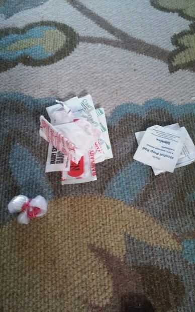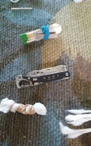 Ahora, hasta negocios; en primer lugar, es un saquito de miniatura que puede ser utilizado para varias cosa. Segundo, un par de tapones para los oídos; Estos pueden ser usados para. reducción de ruido así como un relleno para fugas de agua en una bolsa cuando se aplican con pegamento o con una sustancia adherente. En segundo lugar, cualquier pequeña linterna compacta hará bien para muchas situaciones. Seguido de esto es un tubo largo y un clip; Estas son útiles como titular de la paja y paja para aspirar y filtrar el agua. Papel para escribir es el siguiente para arriba. Seguido por un gasa pad parche para aplicar ungüentos y tal. Después de que se trata de papel de aluminio para señalización y tal vez cocinar hirviendo agua si se usa correctamente, un verso de la Biblia esta incluido (no quiero estar solo!). El siguiente es algo de dinero extra. Después de esto viene pajitas sal y azúcar, no grandes cantidades pero debe durar si se usa con moderación. Q-tips para la aplicación de pasta medicinal o simplemente higiene en general. Seguido por una navaja, fósforos y tira llamativa y un laminado en bolsa. Lo siguiente es curitas, ibuprofeno y preparación almohadillas con alcohol, diferentes usos. Finalmente viene usadas hojas del secador; éstos trabajan muy bien para filtrar el agua. Este es mi primer Instructable! ESPERO QUE LES GUSTE!