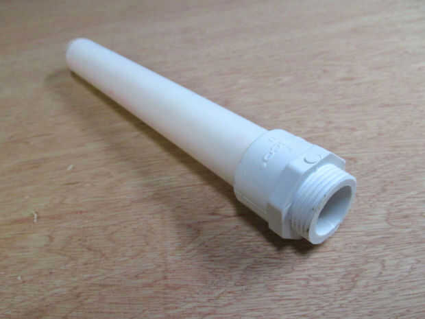 El primer paso de este proyecto es para conectar la sección 10" de 1" tubería de PVC de 1" roscada PVC adaptador. Usted puede simplemente presionar ajuste que estos dos pedazos juntos, pero me sugieren pegado a ellos usando limpiador PVC y cemento de PVC, tal y como lo haría si se colocar tubos de PVC a efectos de plomería. La razón que aconsejo pegarles es que si el adaptador pasa a soltarse del tubo hay es la posibilidad de que podría perder todos sus suministros de pesca.