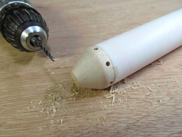 Una vez que el enchufe del extremo delantero se ajustaron en su lugar la próxima cosa que necesita hacer es taladro de unos agujeros como se muestra en la imagen. Estos agujeros no tienen que ser muy profundo, en la mayoría de 1/8" como lo son sólo para asegurar el gancho cuando el equipo no está en uso. Perforaciones aproximadamente 6 alrededor de la clavija para que vas a tener varios puntos de para sujetar el gancho.