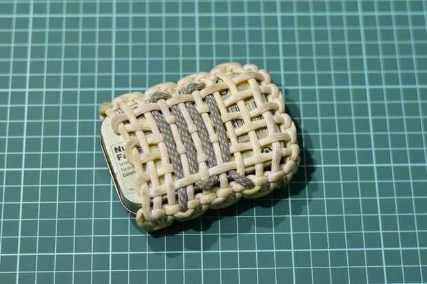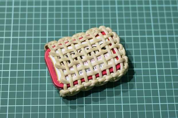 1. en primer lugar tomar unos 25 pies de longitud de paracord y doblar por la mitad. Ahora colóquelo a lo largo de los tres bordes de la lata altoids (dos de largo y un borde corto) para obtener un aproximado de la longitud. Dar aproximadamente una pulgada extra y comenzar a formar el nudo cobra desde el extremo abierto hacia el extremo doblado. Tejer hasta tener la longitud de los tres lados.