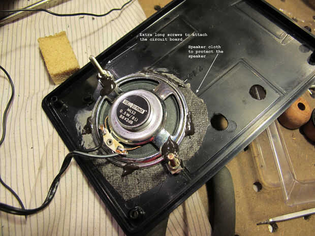 En la foto de arriba el altavoz está conectado a la tapa de caja del proyecto con tornillos más largos que los que vinieron con el kit. Tenga en cuenta también el trapo de la altavoz para proteger el altavoz. El cuadro de proyecto fue comprar en Radio Shack.