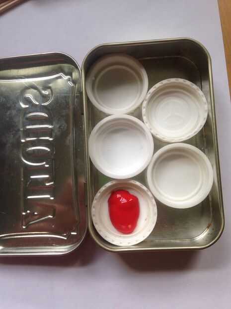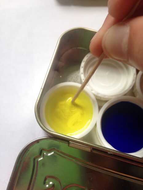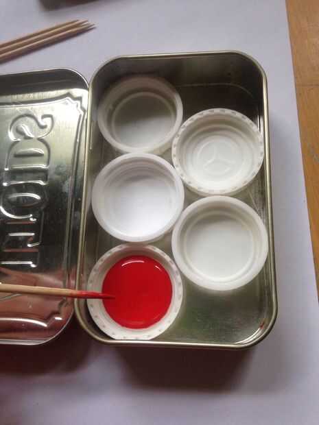 4. mezclar agua y pintura en la tapa con un palillo hasta que esté suave y llena bien la tapa