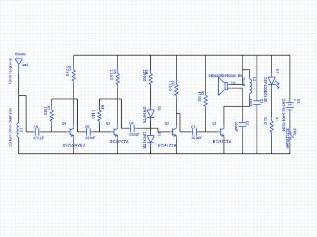 Cada etapa proporciona alta ganancia y la señal es recogida por un front-end no sintonizada. Se puede ver que la parte delantera es no sintonizada como el inductor no tiene un condensador a través de él. Crees que el inductor de 20 vuelta crearía un cortocircuito a tierra. Pero las señales de 100MHz oscilarán en el inductor se pueden seleccionar mediante el condensador de 470p. Las señales de baja frecuencia se tomará a la tierra. La señal de 100MHz se amplifica por las dos primeras etapas y el componente de audio se detecta por los diodos en la base del transistor tercera. El cuarto transistor es un amplificador de audio para manejar el diafragma piezoeléctrico. El inductor en el piezoeléctrico proporciona una carga para el transistor y crea una tensión alta durante la parte de cada ciclo para aumentar el volumen. El condensador de .022uF elimina el componente de alta frecuencia de la señal. Los 47uF a través de la alimentación mejora el rendimiento del circuito evitando que las señales de la etapa de salida, pasando a la parte delantera. Todo esto se ejecutará de una pequeña pila de botón CR2032 3V.