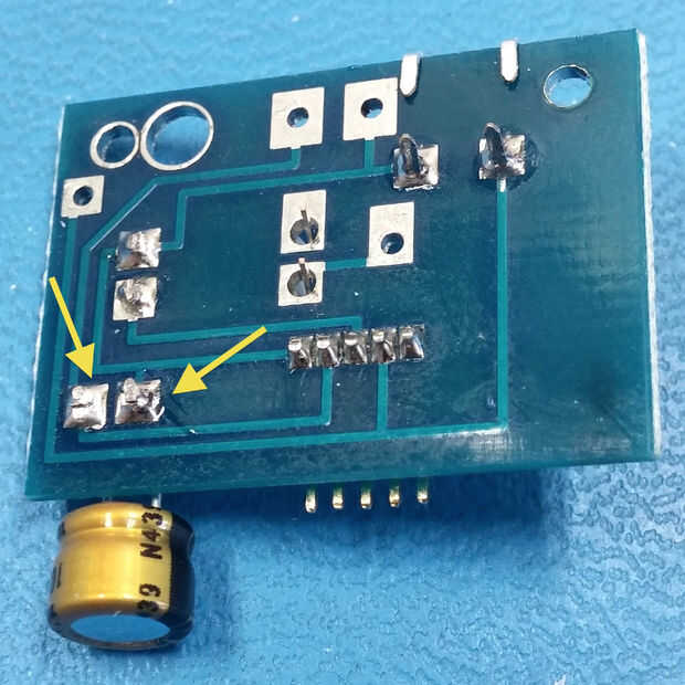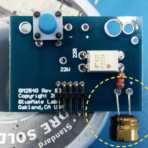 Inserte el condensador, tenga en cuenta la polaridad, la banda negra a la izquierda