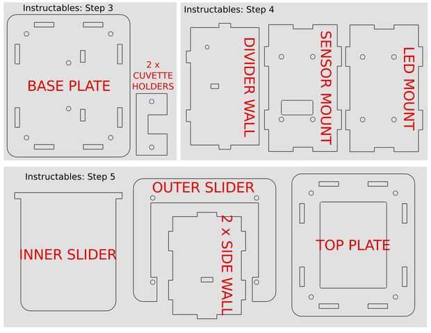 Tomar todas las piezas de acrílico cortado laser negro y emparejarlos con los contornos en la impresión. Esto le ayudará a identificar las partes que usted va a través de los siguientes tres pasos en este instructable.