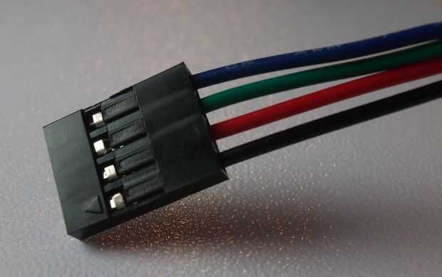 Paso C. Tome uno de los conectores carcasa plástico negro y los cuatro cables pre-prensados. Ubicar el marcador de triángulo en la caja. Esto indica el Pin 1, que es el cable de tierra negro. Empuje el cable negro a través del conector hasta que encaje en su lugar. A continuación, inserte el cable rojo, seguido por el cable verde y finalmente el cable azul. Asegúrese de que todos los cables se sujetan firmemente y no salgan de la vivienda cuando usted tire suavemente en el extremo.