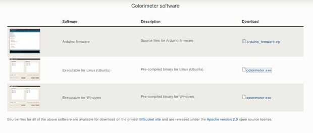 Archivos de código fuente para todo el software anterior están disponibles para su descarga en el sitio del proyecto Bitbucket en http://bitbucket.org/iorodeo/colorimeter/src.