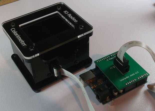 Paso D. Para comprobar que todo funciona correctamente, abra el colorímetro para que puedan ver el LED dentro del dispositivo. En el programa haga clic en el botón de calibración. Debería ver el LED recorrer rápidamente los LEDs rojos, verdes, azul.
