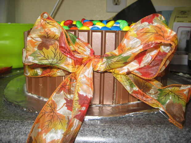 Corte una buena longitud de cable cinta para envolver alrededor de la torta. Me aseguré de suavemente apriete la cinta y ATE en un arco agradable. Yo también mullida hacia fuera el arco después de empató. Esto sirve dos propósitos. 1. ayudar a mantener los Kit Kats en su lugar. 2. parece bastante.