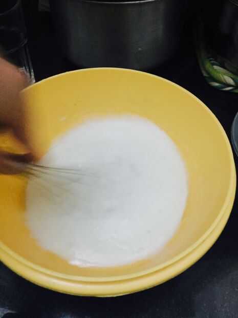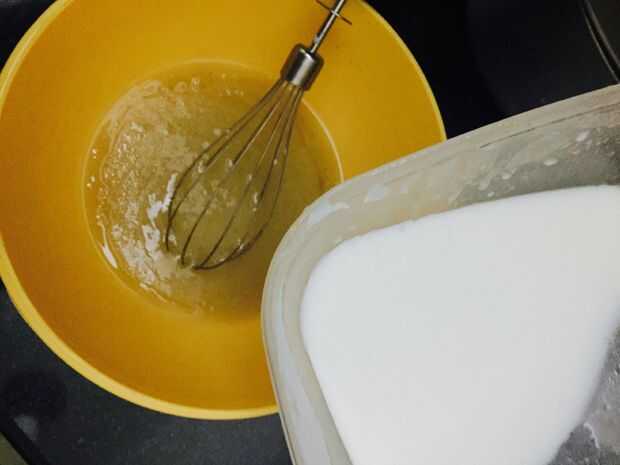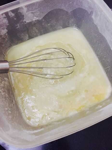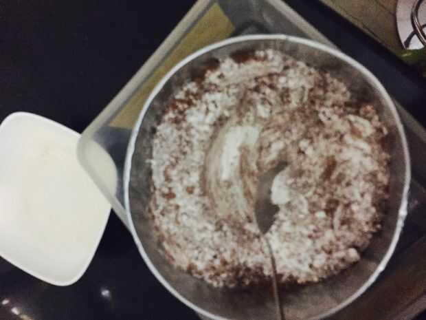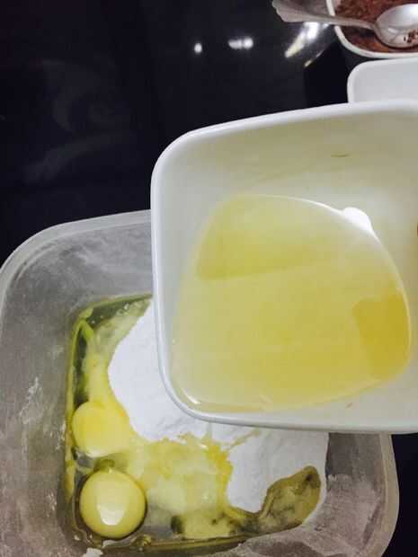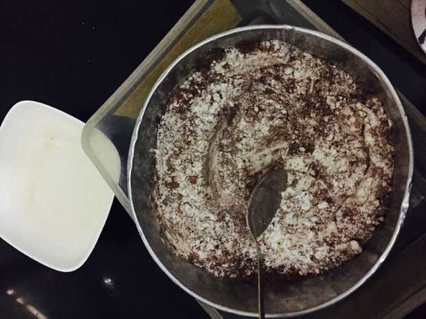 doblar los ingredientes secos a los ingredientes húmedos. agregar agua caliente. Vierta la mezcla en el molde engrasado.