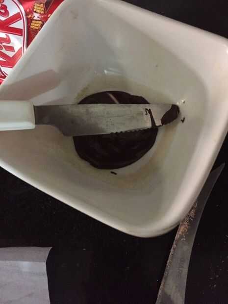 Derretir el chocolate negro en el microondas y usarlo para pegar los palitos de kit kat.