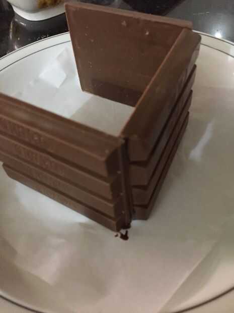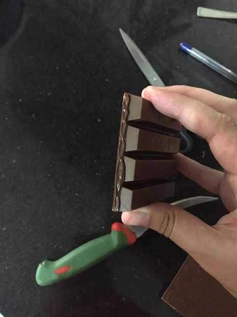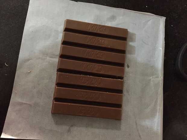 Para hacer la tapa, use un chocolate entero y 3/4 de otro bar, roto en una perforación. Coloque las barras en un pedazo de papel antiadherente y cepillar el extremo roto de la barra de 3/4 con chocolate derretido.
