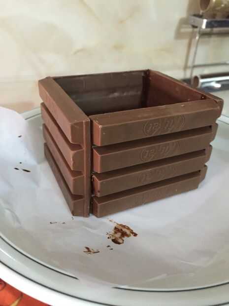 Coloque el extremo corto de la barra de la oblea con chocolate contra el extremo corto de la barra de chocolate de pie. Aplicar una tercera barra de caramelo en el otro extremo de la barra de wafer con chocolate, formando tres cuartas partes de la caja. Repita el procedimiento con una barra de chocolate oblea cuarto y colocarlo entre los dos extremos cortos abiertos para cerrar el cuadro.