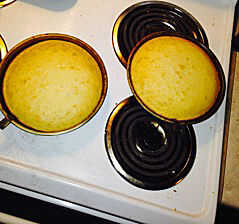 Antes de empezar cualquier cosa rocíe PAM original en dos bandejas y luego Vierta la mezcla en ellos.  Ajuste el horno a 450 grados. Una vez precalentado el horno, luego ajuste el temporizador durante 25 minutos y cocinar las tortas.