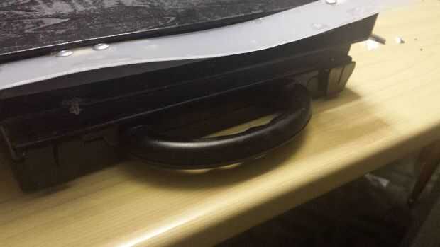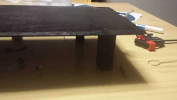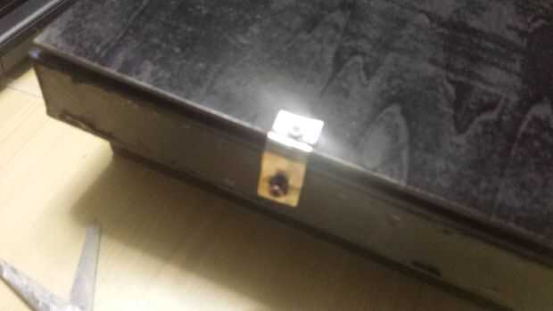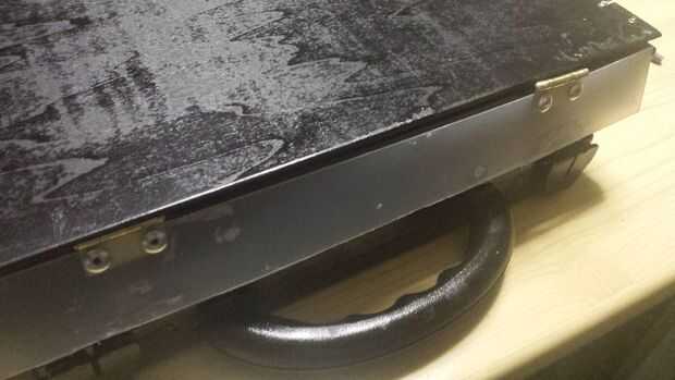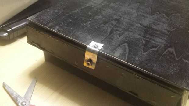 Tomé una pieza de metal y doblada con un ángulo de noventa grados, y lo hice dos agujeros, uno antes de la curva y otra después de la curva, una parte de este objeto que pegue en el tercer panel de madera, con pegamento instantáneo, la otra parte cómo se puede ver en la foto, en el lado frente a las bisagras , Atornillar un tornillo. Hice el cierre. El lugar para el ordenador estaba abierto, así que corté una froma de tira de plástico un papel plástico, y agregué con otros dos bisagras. He creado una cosa para no caer el equipo. 2 pedazos de madera, son el soporte para el panel de madera cual puede abrirse con un ángulo de 180 grados respecto las dos bisagras en el lado. Pongo algunos trozos de goma espuma en el maletín.