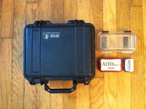 Para el caso principal utiliza un Pelican 1200 pero puede usar cualquier tamaño de caja como se cierra firmemente. Solía tener un maletín de aluminio. Si yo no hubiera dado lejos, yo probablemente habría utilizado en su lugar. Con su caja principal seleccionado, ahora necesita encontrar contenedores para componentes y cables. Tuve una serie de grandes latas de Altoids pequeño, otro pequeño Pelican caso (1010) y caja de un tamaño similar, pero ligeramente más largo y más delgado claro llegó un reloj al aire libre. En cuanto a los casos de componente, cualquier recipiente que permanecerá cerrado en sí mismo, debería funcionar bien. Latas de Altoids pasó a ser el tamaño perfecto para mi caso principal, por lo que utilizan las grandes y pequeñas y colocadas sobre el uso de la caja del reloj, para los componentes más grandes.