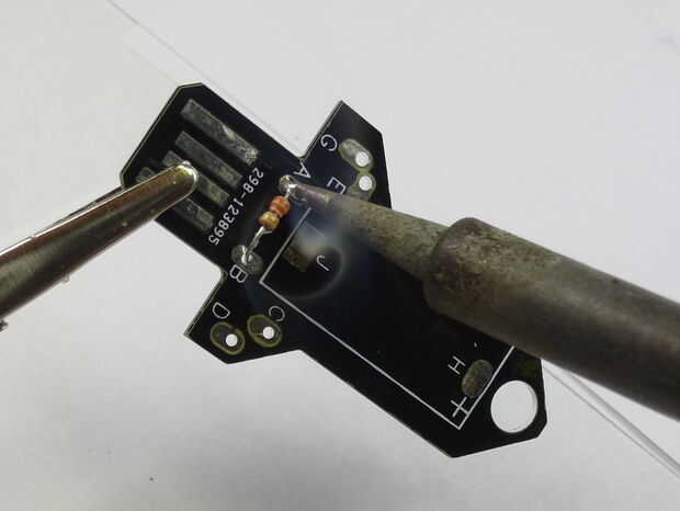 4. Toque la punta de la soldadura de alambre a la plataforma que sólo calentadas. Si está lo suficientemente caliente, se verá la soldadura derretir inmediatamente. Es importante que la soldadura se derrite en ambos la resistencia alambre y la tecla para crear una conexión.