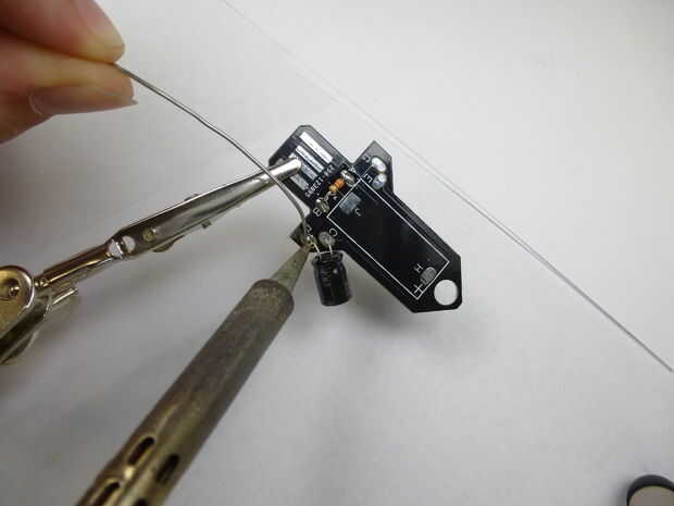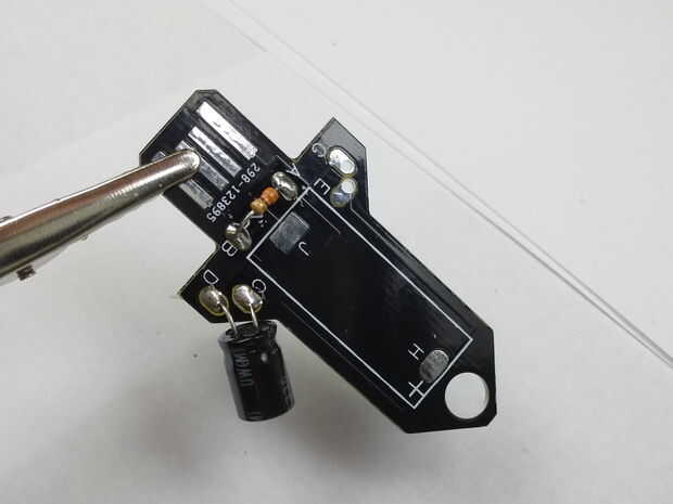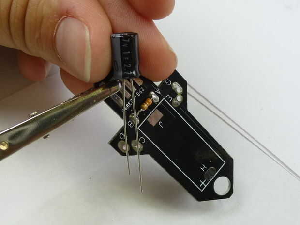 Orientación es importante en el condensador (a diferencia de la resistencia). El condensador tiene un cable positivo y un cable negativo. Hay un signo menos en un lado del condensador negro (PAC) con el cable negativo. El signo menos debe estar lejos del centro de la nave espacial. Otra manera se puede saber los cables apartes es el más corto es el cable negativo.