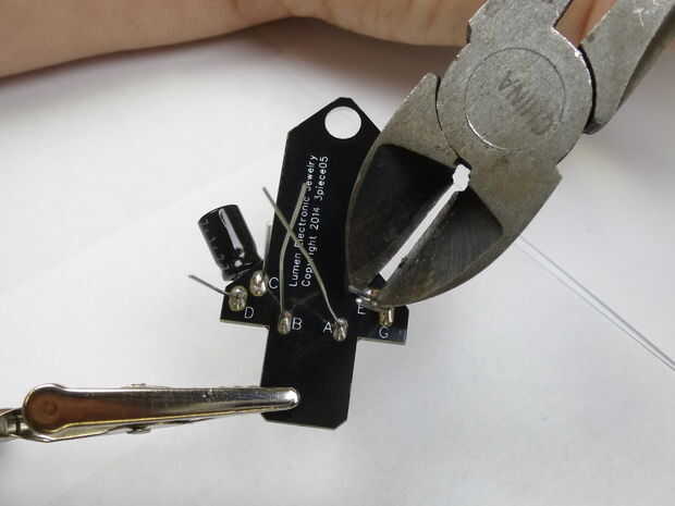 Ahora ajuste los cables. Voltear el tablero y cortar los alambres cerca de la parte posterior de la placa de circuito que pueda. No te preocupes si sobresale un poco corto de alambre, cubrimos estos más adelante.