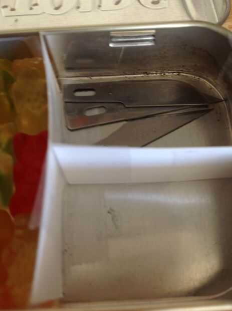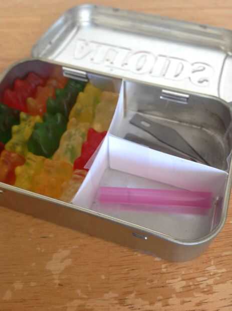 Para poner la máxima cantidad de osos gomosos en el compartimiento grande, organizar cabeza a cabeza como se muestra en la segunda foto. Poner las herramientas de X-Acto en un compartimiento y casi listo. Ahora, corte una pequeña longitud de la paja. Esto se utilizará para el trasplante de estómago. Voy a mostrarles algunas operaciones básicas en el siguiente paso.