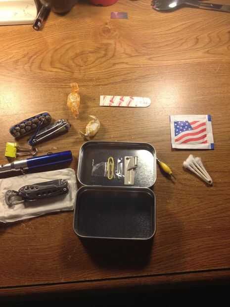 ok esto es lo que decidí que era más necesario y lo más probable que sería necesario que u no puede pensar que llevar pero espera tienes, por lo que elegí, sobre un pie o dos de goma 1 parachord (atado), cortauñas, tejido doblado, 1wet siesta, tira de cinta de doble cara de tech dech herramienta (cabeza pequeña de Philips) 2 algodón hisopos (rotos para adaptarse más fácilmente) , binder clip, un clip, el perno de seguridad, militares estilo p8 (si no corrijan por favor) una multiherramienta micro de leatherman cs un combo brújula linterna silbato y las gotas de tos, (una Zee frío, salas de 1)