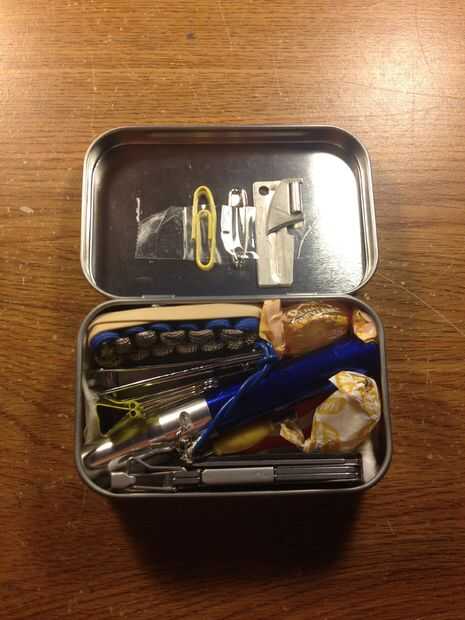 en orden, tejido, pan mojado, tira de la cinta, linterna, parachord, leatherman, hisopos, clavo clip binder, tos, cortador, herramienta de tech dech y cinta solo la puede abridor perno y clip de papel para la tapa