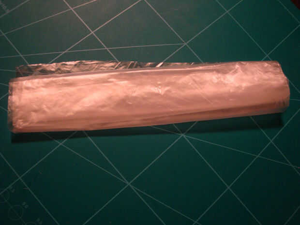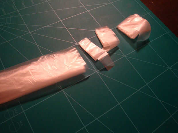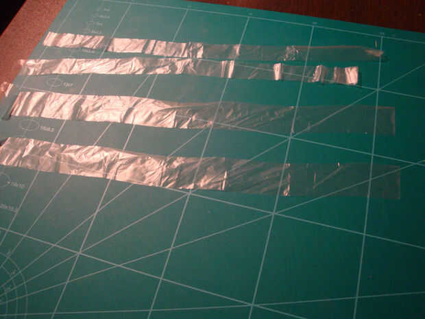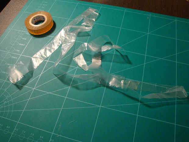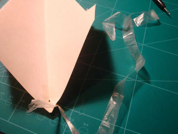 Doble la bolsa un par de veces y corte 2 piezas de la misma. Abrir las piezas y tendrás 4 piezas más de la bolsa. Pégalos junto con un trozo de cinta para hacer aún más y finalmente fijarlo a la parte posterior de la cometa (donde se perforó un agujero antes de)