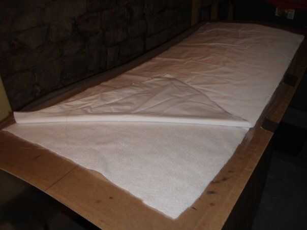 A cada lado del tablero nos tenía una capa de Nylon, una purga de paño para permitir flujo de aire y absorber exceso epoxi y luego la bolsa de plástico. Esto le dio un acabado de nylon mucho más bonito que la última tabla que todavía demostró el tejido.