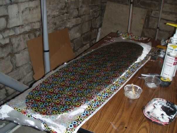 También utilizamos colorante en el epóxico. Esto funcionó bien y nos ha salvado de tener que pintar las tablas más adelante. También ahorró peso. El sol lentamente deteriorará epoxy, pero si no guarda la tabla en su patio trasero debe estar bien.