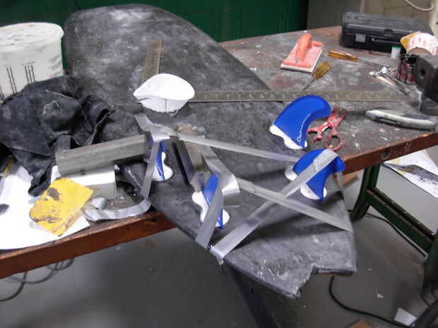 6. una vez seco, viaje la tela sobrante que domina alrededor de los rieles con una dremel y luego mezcla los bordes cortados de fibra de vidrio en la espuma con micro. Ahora poner encima de la superficie superior del mismo modo. Cuando su seco, recortar los bordes y mezclarlos en el más adelante abajo. Vacío embolsado cada bandeja es opcional, pero ayudará el vidrio se adhiere a la espuma. El tejido apretado fue difícil difundir burbujas de y ayudará a la aspiradora.