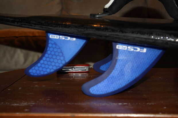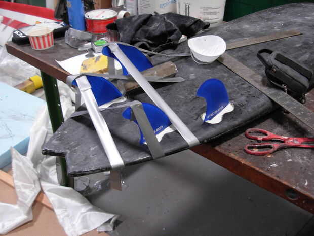 7. hacer una plantilla para donde quiere colocar las aletas con respecto a la línea central del tablero. De nuevo, he copiado mi aleta de colocación de un tablero de la vida real (no hay punto en reinventar la rueda). Trazar en el tablero y cortar los agujeros para los insertos de aleta. Compré un juego de quads de FCS y los partes movibles para sostenerlas. Esto contribuyó aproximadamente el 80% del costo de la placa como estaba usando izquierda sobre espuma y epoxy. Poner las aletas en los insertos y luego los coloque en el tablero como se desee. Un gobernante cuadrado es una buena manera de medir las extremidades en relación con la línea central. Utilice cinta para sostenerlos en su lugar como se muestra. Vierta en un epóxido. Cuando se establece, quitar las aletas y el resto de la bodega se llenan de epoxy/micro hasta la superficie. Cubrir los agujeros de la aleta y el tornillo con cinta para que ninguno llega.