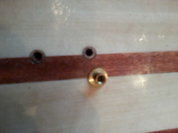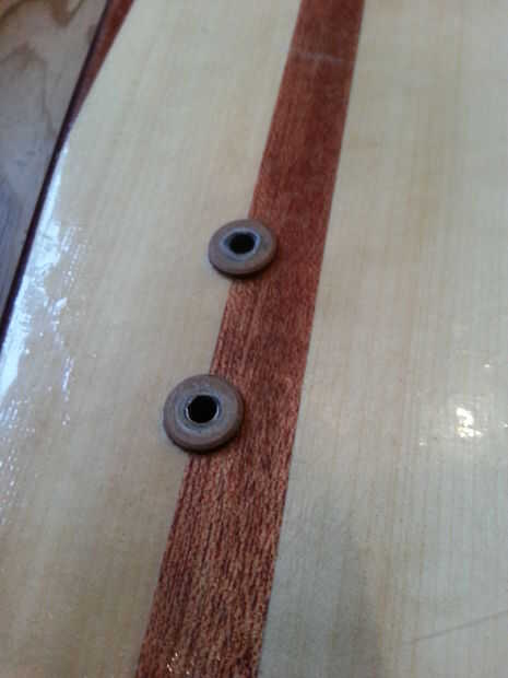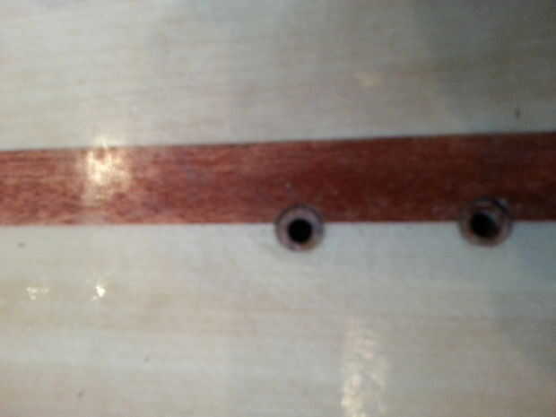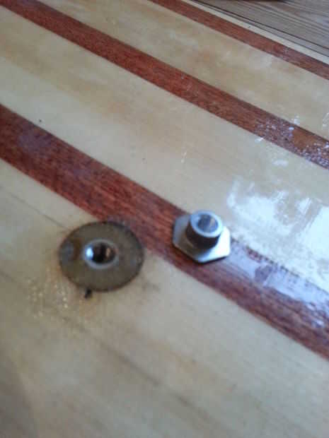 Perfore un agujero donde han marcado. Utilice un drillbit con el mismo diámetro que los insertos. En mi tablero usé 16 mm. Coloque los insertos. Y llenarlo con epoxi. Cuando el cura epoxi lijar al ras con el tablero y quitar cera de los insertos. para hacer la inserción extra resistente puede Agregar un trocito de tela de fibra de vidrio encima de la inserción (tienes que perforar suavemente para abrirlo).