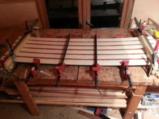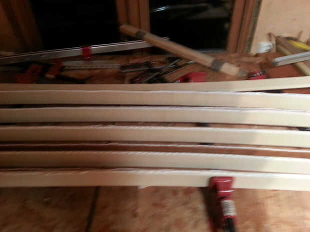 Colocar los perfiles en el carril de sujeción, con la cara más pequeña hacia arriba. Agregar el pegamento. Sujetarlos suavemente. Lugar de trozos de madera en ambos extremos, cuatro piezas en total, uno en la parte inferior y uno en la parte superior, utilice abrazaderas. Estas piezas de madera son alinear todos los perfiles. Después de instalar las piezas de la alineación. Apriete las abrazaderas más duro, pero no es tan difícil que exprima todo el pegamento. Deje que el pegamento dire. Se puede utilizar cola para madera poliuretano o normal. Creo que el pegamento de madera normal es el mejor; es barato y "no" tóxicos.