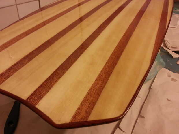 Coloque la Junta en una postura y aplique una capa caliente. Un abrigo caliente es una fina capa de epoxi. Esta capa se retire llenar el paño de fibra de vidrio y hacerlo más fuerte y con un acabado más agradable. Aplicar una fina capa de epoxi sobre los rieles, así. También es posible aplicar una fina capa de fibra de vidrio en los rieles, pero no veo esto necesario si utiliza rieles de madera. La madera de cumaru es muy duro y resistente al agua, se hunde en el agua.