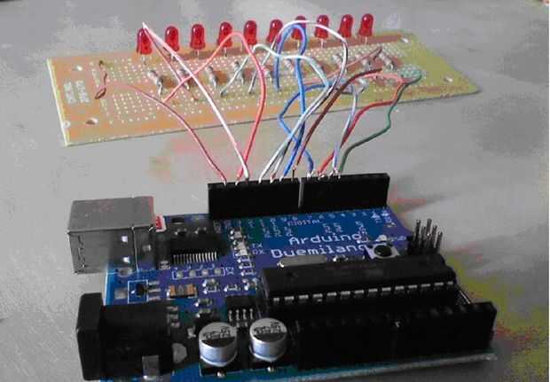 Inserte cada uno en su respetable perno siendo la izquierda más LED (según imagen) en el Pin 13, otro a su derecha en el Pin 12 y así sucesivamente y así sucesivamente. Si se hace correctamente, el LED más lejano a la derecha estará en el Pin 4.