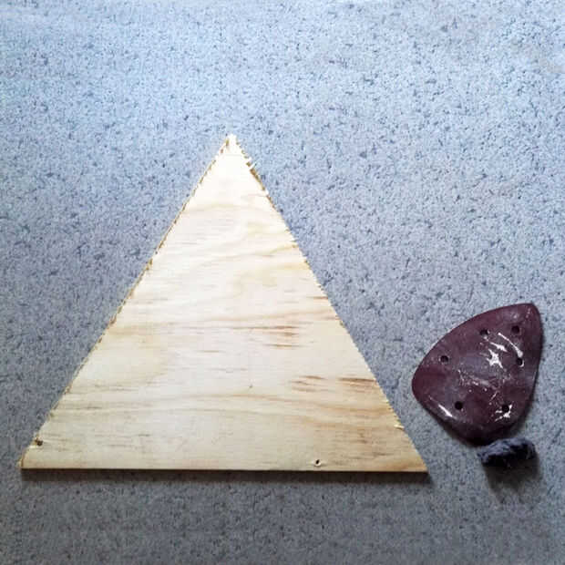 La pieza de madera que era un poco demasiado pequeña para la tapa del orificio (pieza del triángulo equilátero) así que utilizamos una broca de madera que teníamos en el almacén. Puede utilizar prácticamente cualquier bit para esto, como va a estar bajo la cama del gato cuando esté en uso.